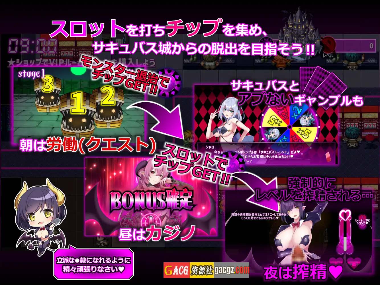 身为〇隶,你需要完成劳动和榨精义务,同时在魅魔运营的赌场中玩老虎机,通过收集筹码来推进剧情。
